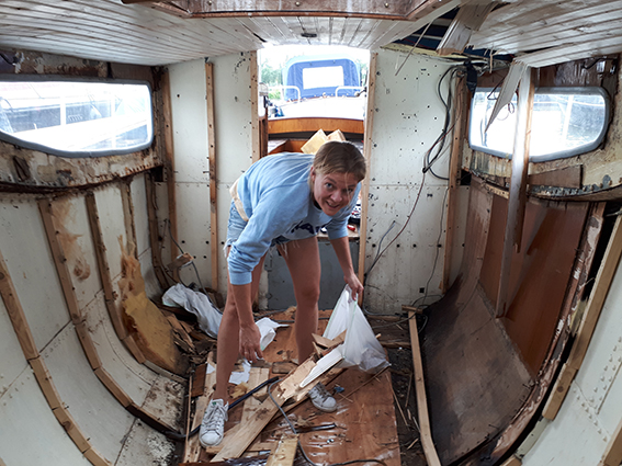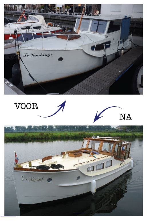 Deze bakdekker is ongeveer 7,5 meter lang en heeft een kleine kajuit waar zeker 2 mensen in kunnen slapen. In de winter van 2018/2019 gaan we hem van 'scratch' weer opbouwen. Dat wil zeggen: oude motor eruit, nieuwe motor eruit, metalen kap eraf en vervangen door houten ramen aan de voorzijde en een canvastent er overheen, railing eraf, wc eruit, hout uit de kajuit eruit, schuuren en verfen, isoleren, nieuwe betimmering voor de kajuit aanbrengen, electra en vast nog veel meer. Zie hiernaast een afbeelding hoe het moet gaan worden!